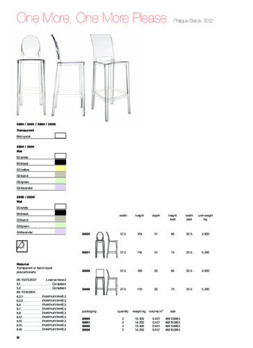 Svým tvarem připomíná stoličky z 19. století. Linie nohou je zaoblená a lehce kolmá, což je charakteristickým symbolem klasických stoliček vysoké úrovně. Charles Ghost je vyráběna z jediného kusu polykarbonátu, díky čemuž je neobyčejně pevná a velice odolná vůči povětrnostním podmínkám. Materiál je 100% recyklovatelný a ekologicky šetrný. Díky lehkosti a stohovatelnosti je také velmi praktická. Nabízíme ji ve třech velikostech, což umožňuje výběr správného kousku - ať už hledáte židli pro neformální příležitosti nebo na doplnění vašeho pracovního či barového koutku. Tato stolička, pod níž se podepsal světoznámý designér Phillipe Starck, vnese kouzlo do jakéhokoliv typu prostoru nebo stylu. Rozměr tohoto modelu je 37,5 x 51 x 114 cm (šířka x hloubka x výška), přičemž výška sezení je 75 cm.
