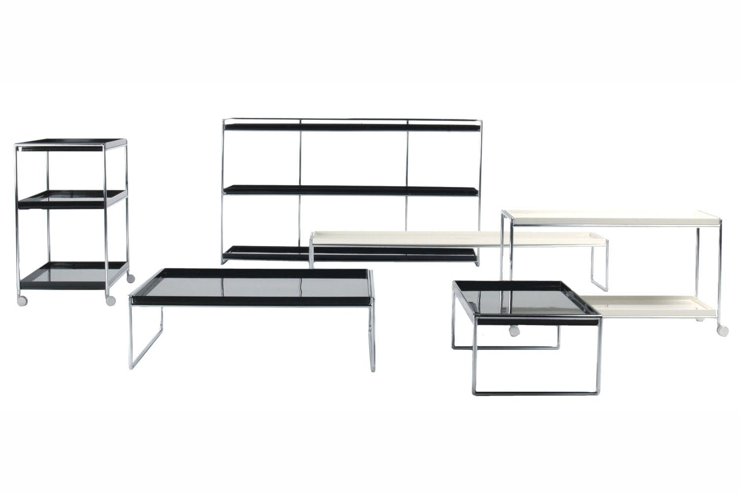 Stůl vznikl díky spolupráci značky Kartell a designéra Piera Lissoniho. Kolekce Trays zahrnuje konferenční, odkládací a servírovací stolky vhodné do domácnosti nebo kanceláře, které svými tvary připomínají lakované japonské podnosy. Stolky jsou dostupné v lesklé bílé nebo černé barvě s chromovanou barvou konstrukce. Rozměr tohoto modelu 80 x 40 x 25,3 cm (šířka x hloubka x výška).
