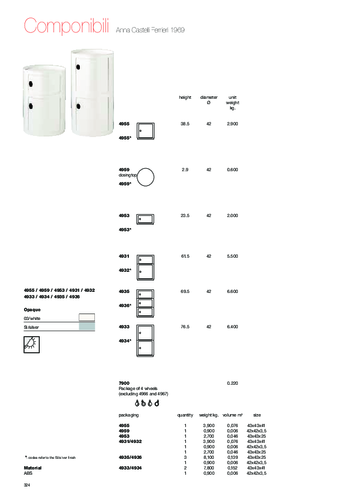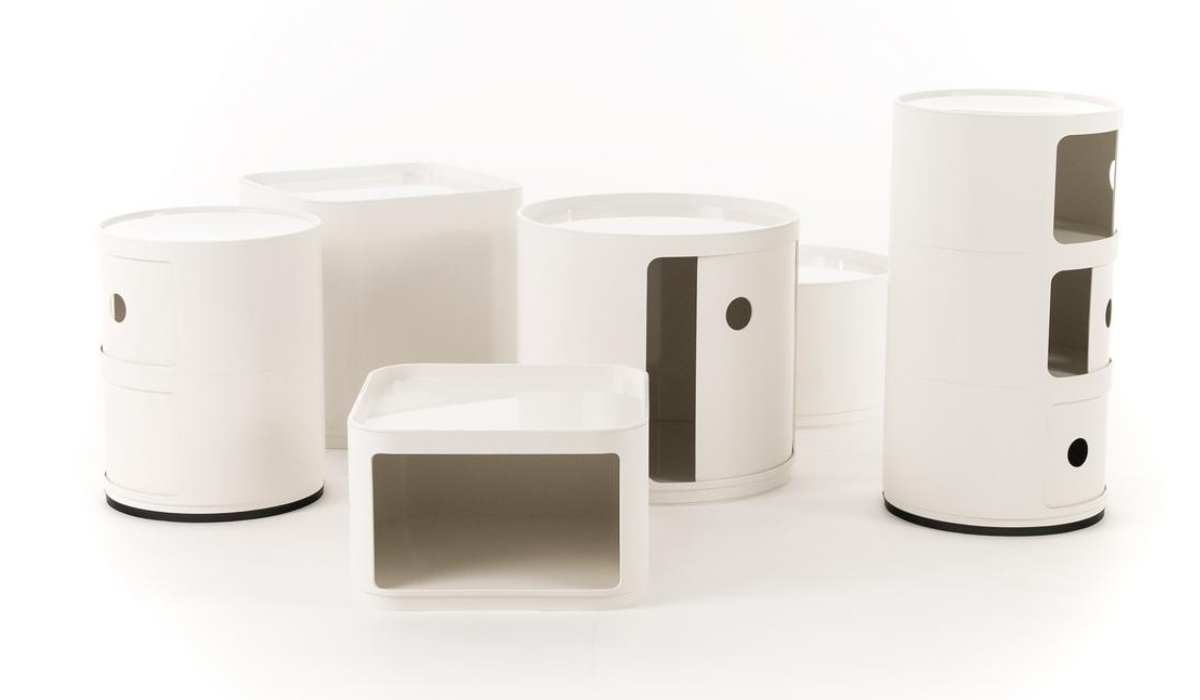 Kontejner Componibili Round vznikl pod hlavičkou designérů Fabia Novembre a Anny Castelli Ferrier. Componibili je bestsellerem značky Kartell již od roku 1967. Vyniká svou multifunkčností a praktičností, díky svým rozměrům se vejde do každé místnosti. Můžete ho tak využít v koupelně jako skříňku na doplňky, v ložnici jako noční stolek, v kuchyni i obývacím nebo dětském pokoji. Díky své odolnosti se hodí nejen do interiéru ale i do exteriéru. Compononibili vstoupilo do dějin, je totiž vystaveno ve významném muzeu moderního umění v New Yorku a v pařížském Centre Geoure Pompidou. Tento kontejner si můžete sami složit. V nabídce naleznete vrchní část, velký a malý kontejner, dvířka i kolečka.