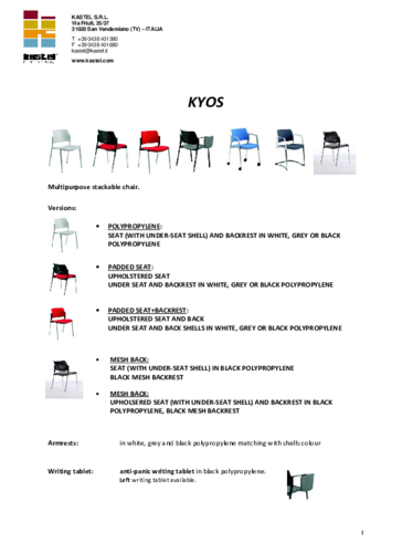 Víceúčelová stohovatelná židle KYOS s ocelovou podnoží a plastovým sedákem a opěrákem z kvalitního a pružného polypropylenu. Perforovaný opěrák je výrazným a dekorativním detailem, který dodává židli na atraktivitě. Jednoduchá, moderní a odolná židle je zároveň snadno udržovatelná, dekorativní a komfortní. Kovová podnož a rám z ocelových trubek o Ø 2,2 cm je dodávána v několika provedení: v černém / bílém laku, barvě hliníku či v chromu. Součástí základny jsou také plastové kluzáky. Pohodlný sedák a perforovaný opěrák dodáváme ve 3 barevných variantách provedení (šedá / černá / bílá). Barvení polypropylenu probíhá v souladu s mezinárodními standardy bez použití těžkých kovů. Lze se domluvit i na provedení žáruvzdorné úpravy. V nabídce je také Stohovací vozík KC17.