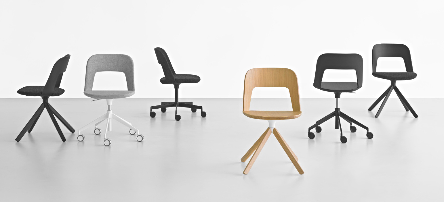 Pohodlná a praktická židle s centrální dřevěnou podnoží a celočalouněným otočným sedákem. Díky široké škále variant čalounění osvěží každý interiér.