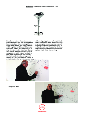 Celosvětově známý architekt a držitel několika prestižních designérských cen Stefano Giovannoni vytvořil na první pohled poutavou kolekci židlí pro ikonickou značku Magis. Práce oblíbeného italského designéra z je ztělesněním ohromující dávky estetičnosti a funkčnosti. V kolekci najdete barové židle Bombo, Al Bombo a židli s kolečkami Bombo Wheels.