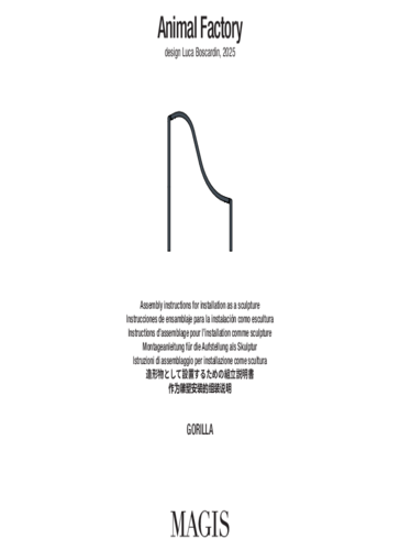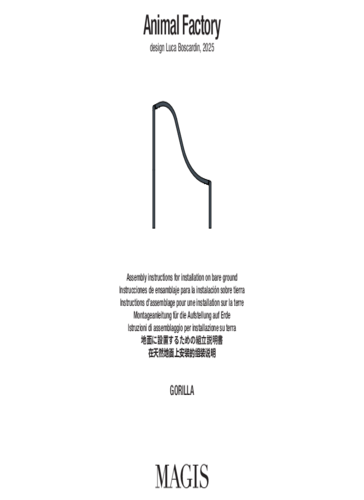 Gorilla z kolekce Animal Factory od značky Magis je stylizovaná socha inspirovaná siluetou gorily, navržená designérem Lucou Boscardinem. Objekt slouží jako dětská prolézačka a designový prvek vhodný do veřejného venkovního prostoru – parků, hřišť či městských zón. Konstrukce je vyrobena z ocelových trubek, které jsou nejprve ošetřeny zinkovým základním nátěrem a následně lakovány práškovou polyesterovou barvou. Díky této úpravě je Gorilla odolná vůči povětrnostním vlivům a připravena na intenzivní venkovní použití. Její hravá geometrie vybízí k interakci – lezení, prolézání i balancování. Stejně jako ostatní prvky kolekce je i Gorilla důkazem toho, že design může být funkční, zábavný a trvale udržitelný.