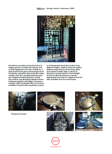 Někdy i nenápadně vypadající nábytek může být předmětem dlouhého procesu vývoje a inovace. To se přesně stalo u kolekce Déjà-vu. Jednoduchá, minimalistická kolekce Déjà-vu nám evokuje pocit známosti, familiarity a hlavně domova a bezpečí. Japonský návrhář Naoto Fukasawa ji vytvořil ve spolupráci s italskou značkou Magis. Nábytek je lehký, vysoce odolný a jednoduchý a právě proto jsme si ho tak zamilovali - v interiéru nevyžaduje žádné místo na výsluní, přitom se ale vždy těšíme jeho přítomností. Kousky z kolekce Déjà-vu - stůl, židle, barová židle a zrcadlo budou vypadat skvěle u vás doma i v kanceláři.
