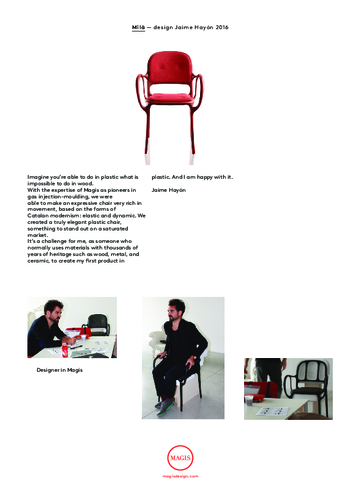 Plast je úžasný materiál, můžete ho vytvarovat do tvarů, o kterých se vám ani nesnilo, jsou navíc pevné a snadné na údržbu. Toho si plně je vědom italský výrobce Magis, který jako první přišel s revoluční technologií vstřikování plastu. Pro designéra Jaimieho Hayóna, který si dříve zakládal výlučně na tradičních materiálech jako jsou dřevo, kov nebo keramika, bylo vytvoření plastové kolekce MILA skutečnou výzvou. Jak ale sám říká, s výsledkem je spokojený a není divu - celá kolekce se nese v duchu elegance, nadčasovosti, přitom je ale novátorská a moderní.