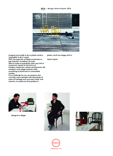 Plast je úžasný materiál, můžete ho vytvarovat do tvarů, o kterých se vám ani nesnilo, jsou navíc pevné a snadné na údržbu. Toho si plně je vědom italský výrobce Magis, který jako první přišel s revoluční technologií vstřikování plastu. Pro designéra Jaimieho Hayóna, který si dříve zakládal výlučně na tradičních materiálech jako jsou dřevo, kov nebo keramika, bylo vytvoření plastové kolekce MILA skutečnou výzvou. Jak ale sám říká, s výsledkem je spokojený a není divu - celá kolekce se nese v duchu elegance, nadčasovosti, přitom je ale novátorská a moderní.