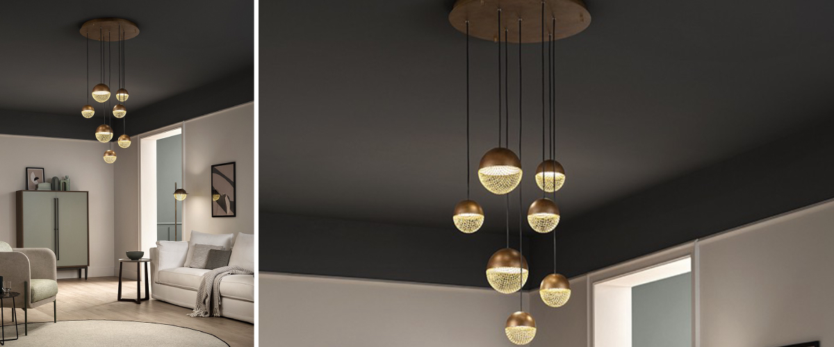 Designová závěsná lampa IGLÙ S7 nabízí svérázný a originální vzhled, který nelze přehlédnout. Vidět v ní můžete různé motivy, nám však nejvíce připomíná basketbalové míče nebo model planet sluneční soustavy. Závěsná lampa se bude hodit například do vašeho obýváku nad jídelní stůl, jako neotřelý lustr do kanceláře nebo do komerčních prostor. Struktura lampy je velmi simplistická. Sestává z kruhové základny, z níž je směrem dolů zavěšeno 7 difuzérů. Sférické difuzéry jsou z půlky tvořené celistvým plátem kovu a z druhé poloviny pak oblou kovovou mřížkou. Konstrukce je dostupná v několika provedeních matně či leskle lakovaného kovu. Retro nebo moderna? Záleží jen na vaší interpretaci a fantazii!