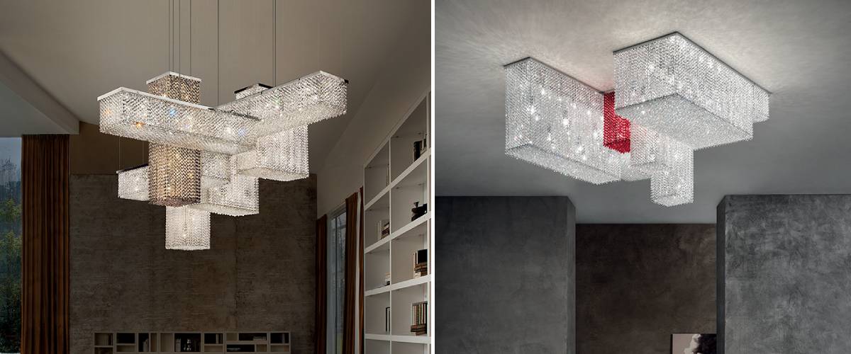 Tento nepřehlédnutelný okázalý lustr CUBO COMBO S 175 ze skleněných krystalů a kovu je zcela exkluzivním doplňkem do luxusních interiérů, kde se snoubí vytříbený vkus a elegance. Svítidlo má 7 samostatných obdélníkových světelných jednotek, u nichž si můžete vybrat provedení barevných krystalů z transparentního, broušeného i polobroušeného skla. Je tak jen na vás, jakou kombinaci vymyslíte - výsledek bude vždy originál, který dokonale zapadne právě do vašeho prostoru. Unikátní lustr CUBO COMBO S 175 si v ničem nezadá s opravdovou uměleckou instalaci. Bude se krásně vyjímat nad jídelním stolem, sedačkou v obývacím pokoji nebo nad schodištěm ve vstupní hale. Umístit jej můžete také do luxusní kanceláře.