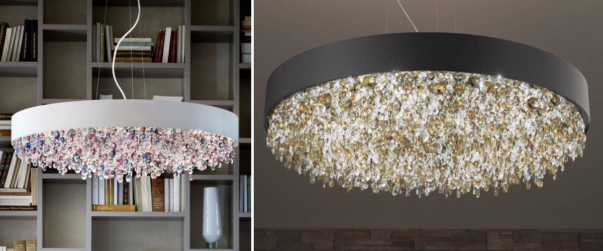 Tento nepřehlédnutelný okázalý lustr OLÁ S12 z kovu se skleněnými krystaly si zamilují všichni příznivci blyštivého designu. Světlo proniká shlukem pestrobarevných kamínků, které si můžete vybrat v 8 variantách barevných kombinací. Produkt je k dispozici v provedení se standardní žárovkou nebo stmívatelnou LED žárovkou. Hodí se do každého moderního interiéru, kde se nebojí experimentovat. V závislosti na barevné verzi svítidla můžete při jeho aranžování pracovat s bohatou fantazií. Je jen na vás, jestli vašim hostům bude připomínat sladké bonbony nebo záplavu zlatavých drahokamů. Ať už závěsné svítidlo OLÁ S12 umístíte do obývacího pokoje, ložnice, jídelny nebo luxusní kanceláře, stane se okamžitě středobodem místnosti, který k sobě poutá pozornost vašich hostů nebo klientů!