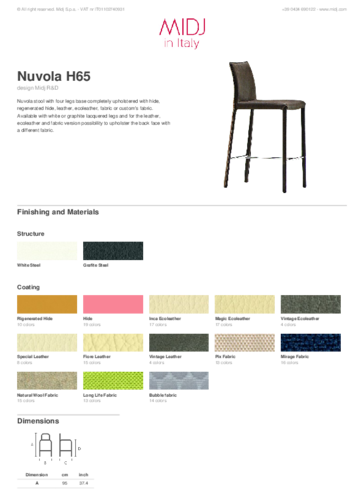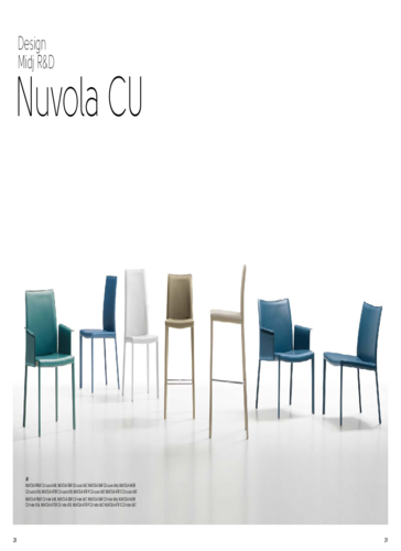 Kolekce NUVOLA od italské značky MIDJ představuje archetyp židle. Základnu tvoří čtyři rovné linie složené tím nejklasičtějším způsobem. Její jednoduchost zvýrazňují jasné barvy a zajímavě zvolené materiály. Vše podtrhují propracované detaily a viditelné švy. Původní řada byla zcela čalouněná, ale nyní je rozšířena o modely s kovovou podnoží pro všestrannější použití. U čalounění je na výběr z řady textilií, kůže či koženky a lze tak dosáhnout mnoha variací. Zářivé barvy kolekce, zejména celočalouněné monochromatické verze, se budou vyjímat v salóncích, restauracích či hotelech.