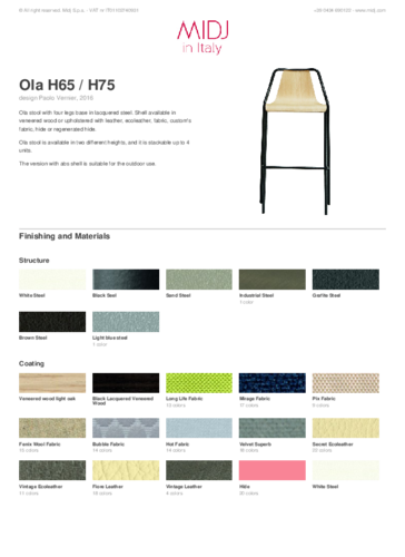 Kolekce OLA vychází z principu, že méně je více. Byly tedy odstraněny všechny nepotřebné prvky, aby zůstal jen čistý design. Kolekce byla navržena samotným prezidentem značky MIDJ, Paolem Vernierem. Ten je proslulý tím, že dokáže zkombinovat design s technologií a vytvořit tak skutečně funkční a pohodlný nábytek. Řada spojuje dva kontrastní prvky. Na jedné straně kovové trubice a na druhé ladný sedák ze dřeva, kovu či čalouněný látkou nebo kůží.