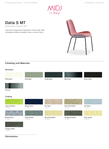 U kolekce DALIA od španělské návrhářky Beatriz Sempere oceníte především její praktičnost. Designové kusy jsou ideálním řešením zejména do kanceláří a pracovních prostorů. Řadu spolují zcela čalouněné sedáky a kovová či dřevěná podnož. Čalounění z kvalitního textilu či kůže je možné kombinovat ze 2 barev. Pro tuto variantu nás neváhejte kontaktovat. Pro Beatriz jsou charakteristická frivolita a nekonformnost sedmdesátých let provedená v moderním pojetí pro potřeby současného člověka.