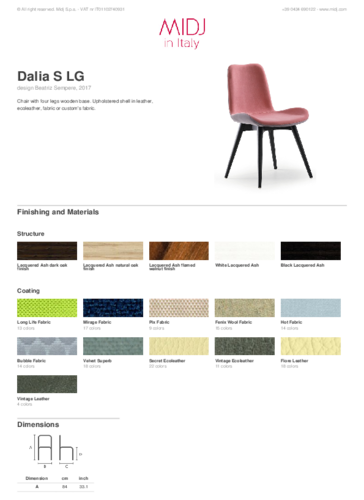 U kolekce DALIA od španělské návrhářky Beatriz Sempere oceníte především její praktičnost. Designové kusy jsou ideálním řešením zejména do kanceláří a pracovních prostorů. Řadu spolují zcela čalouněné sedáky a kovová či dřevěná podnož. Čalounění z kvalitního textilu či kůže je možné kombinovat ze 2 barev. Pro tuto variantu nás neváhejte kontaktovat. Pro Beatriz jsou charakteristická frivolita a nekonformnost sedmdesátých let provedená v moderním pojetí pro potřeby současného člověka.