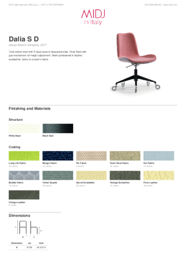U kolekce DALIA od španělské návrhářky Beatriz Sempere oceníte především její praktičnost. Designové kusy jsou ideálním řešením zejména do kanceláří a pracovních prostorů. Řadu spolují zcela čalouněné sedáky a kovová či dřevěná podnož. Čalounění z kvalitního textilu či kůže je možné kombinovat ze 2 barev. Pro tuto variantu nás neváhejte kontaktovat. Pro Beatriz jsou charakteristická frivolita a nekonformnost sedmdesátých let provedená v moderním pojetí pro potřeby současného člověka.