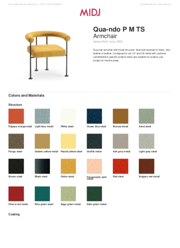 Křeslo, sedačka a židle QUA-NDO vznikly se spolupráce italské značky MIDJ s návrhářem Paolem Vernierem a průmyslovým designérem Michi Jungem. Kovová konstrukce rovných linií příjemně kontrastuje se sedákem a opěrákem organických tvarů. Kousky lze snadno zkombinovat spolu, ale poslouží i jako solitérní posezení. Některé typy čalounění jsou vhodné i pro venkovní podmínky (s výjimkou přímořských oblastí), takže si stylový obývák můžete dopřát i pod širým nebem.
