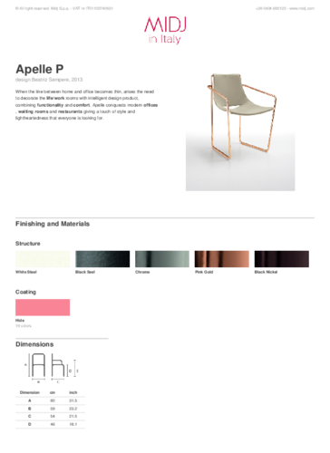 Kolekce APELLE od španělské návrhářky Beatriz Sempere je charakteristická svými měkkými zaoblenými tvary. Celá řada kombinuje kvalitní ocelový rám a pravou kůži. Tyto špičkové materiály zaručující nezbytnou flexibilitu a splňují velmi vysoké nároky pro výrobu. Návrhářka šlo o to propojit klasickou s moderní estetikou, o čemž je celá řada. Na první pohled zaujmou zejména stolky potažené kůží. Inteligentní design produktu je kombinován s funkčností a komfortem. Řada je ideální řešení pro moderní kanceláře nebo restaurace, kde dodá punc stylu a hravosti a každého na první pohled zaujme.