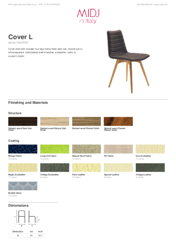 Symbolem kolekce COVER je důmyslnost a elegance pro stylovou domácnost i moderní kanceláře s charismatem propracovaného italského designu značky MIDJ. Tyto pohodlné židle jsou lehké, odolné a schválené jako třída 1IM a jsou tedy žáruvzdorné. Moderní kolekce je vysoce univerzální díky mnoha typům provedení a zapadnou tak do veškerých interiérů. Všechny židle je možné očalounit i vlastní látkou při objednávce od 6 kusů.