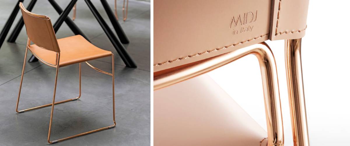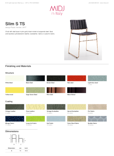 Kolekce SLIM od Paola Verniera, prezidenta a zakladatele italské značky MIDJ, vychází ze svého názvu a určuje tak svůj koncept a jednotlivé prvky, které má. Řada je lehká, vzdušná, skladná a jemná. Židle jsou velice univerzální, hodí se tedy do soukromých i veřejných prostorů. Svým jedinečným designem a propracovaně atypickými detaily jsou stylovou volbou zejména do kaváren a jídelen. Kovová ližinová konstrukce je doplněna sedákem a opěradlem v kovovém odolném provedení vhodném i pro užívání v exteriéru, koženém elegentním provedení, nebo v prorošívaném čalounění.