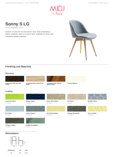 Kolekce SONNY odráží styl italské značky MIDJ a její filozofii měkkého designu, čemuž ale chce dosáhnout nejen výběrem měkkých materiálů, ale také trvanlivých materiálů jako je dřevo a kov. Tato řada jejich výzvu splnila. Teplo látky a kůže je zkombinováno s podnožemi z dřeva či kovu mnoha barev a tvarů. Sedáky je možné nakombinovat ze dvou různých látek dle výběru. Pro tuto možnost nás neváhejtekontaktovat.