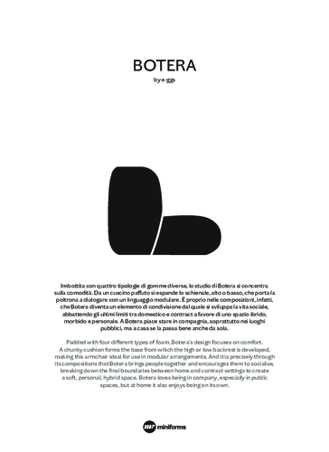 Harmonické linie křesla Botera má na svědomí designérské studio E-ggs. Svůj účel splní jak o samotě, tak v kombinaci několika kusů. Je vhodné k použití v modulárním uspořádání a bude skvělým společníkem v komerčních i soukromých prostorách. Pohodlí zajišťuje konstrukce polstrovaná čtyřmi různými druhy pěn. Široká nabídka barev a materiálů čalounění zajistí, že křeslo snadno sladíte se zbytkem místnosti.