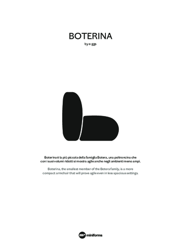 Harmonické linie křesla Boterina má na svědomí designérské studio E-ggs. Svůj účel splní jak o samotě, tak v kombinaci několika kusů. Je nejmenším členem této řady nábytku a bude skvělým společníkem v komerčních i soukromých prostorách. Pohodlí zajišťuje konstrukce polstrovaná čtyřmi různými druhy pěn. Široká nabídka barev a materiálů čalounění zajistí, že křeslo snadno sladíte se zbytkem místnosti.
