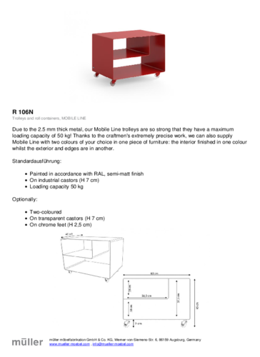Minimalistický pojízdný stolek R 106 v dokonalém designu přináší krásu, kde funkce a individualita splývají s dokonalostí. Konstrukce stolku z 2,5 mm kovového plátu je vzdušná, unese až 50 kg a snadno se přizpůsobí jakémukoliv prostoru. U stolku můžete vybírat barevné provedení vnitřní a vnější strany samostatně. To může být buď stejné nebo lze popustit uzdu vaší fantazii a barvy namíchat. Díky kolečkům se dá se stolkem velmi snadno manipulovat a vy ho tak můžete pokaždé přemístit tam, kam zrovna potřebujete.