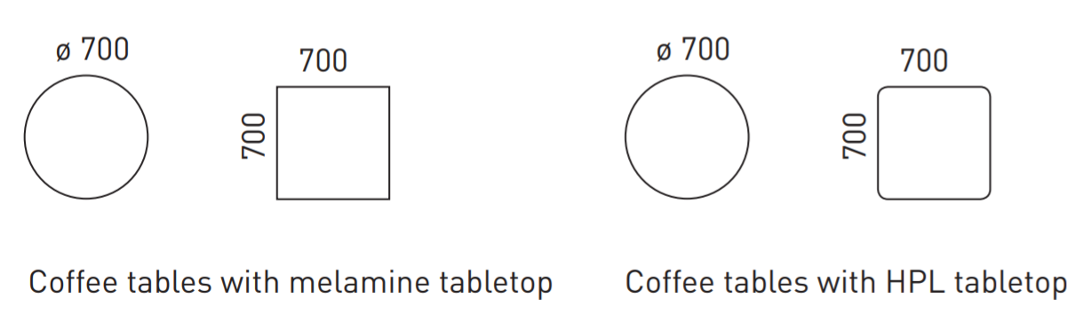 Kruhové i čtvercové stolové desky NOVA WOOD jsou vyrobeny z melaminu nebo HPL v několika různých barevných provedeních o tloušťce 25 mm s 2 mm ABS hranou (HPL má tloušťku 26 mm) a stojí na podnoži z jasanového dřeva v různých variantách moření.