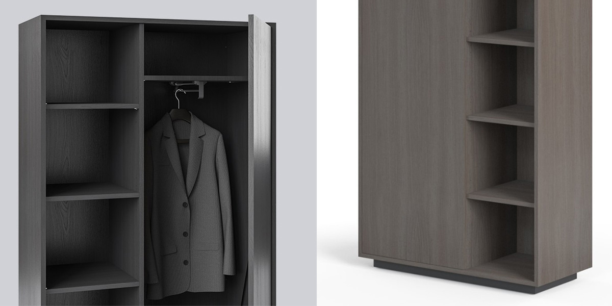 Komoda (1) i skříň (2) ARQUS perfektně doplní pracivní stoly a nabídnou dostatek úložných prostor pro dokumenty, knihy nebo například kabáty či další osobní věci. Uzavřené části skryjí to, co nemusí být vidět, otevřené police zase naopak mohou sloužit jako výloha pracovních úspěchů nebo dekorací.