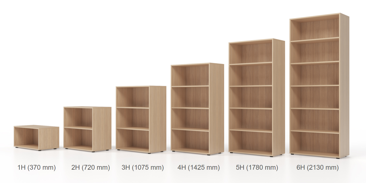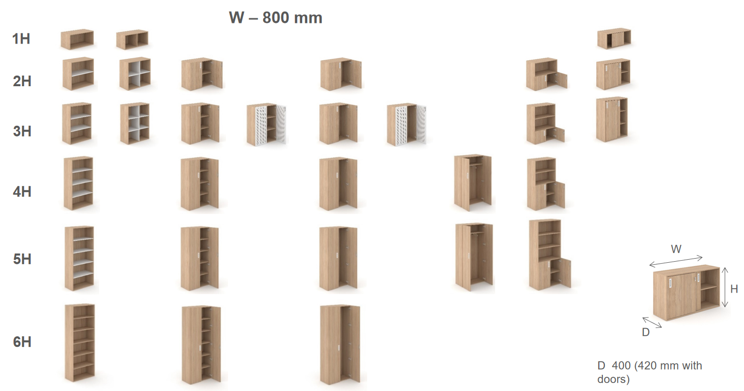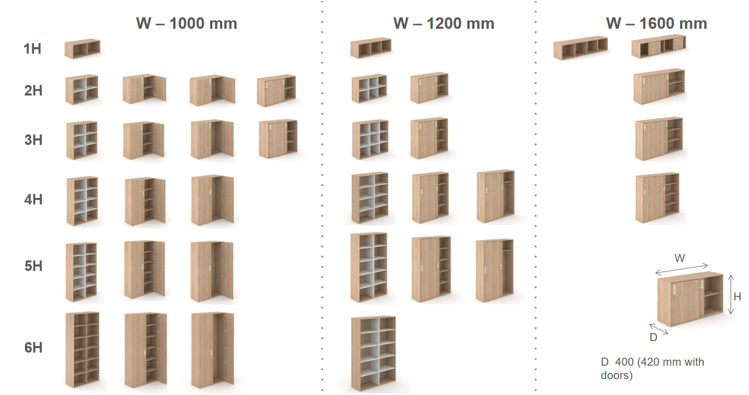 Ucelený modulární systém skříňového kancelářského nábytku nabízí širokou škálou prvků šesti výškových úrovní (1H – 6H, resp. 370mm – 2130mm) a čtyř šířek (800-1000-1200-1600mm). Skříně lze jednoduše kombinovat, skládat na sebe a vytvořit si tak svou vlastní sestavu. Kromě jednotlivých kousků lze kombinovat i materiály, např. lamino s dýhou.