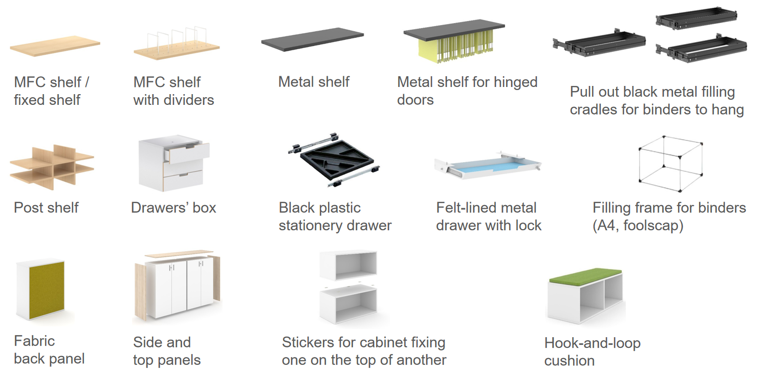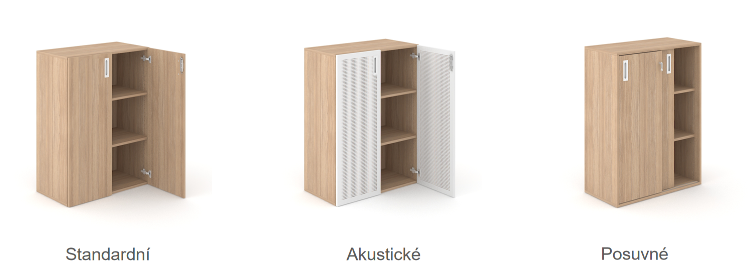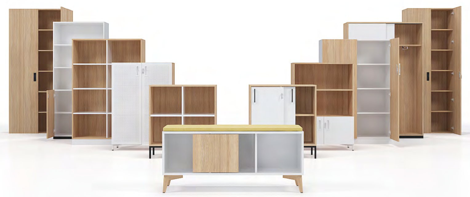 Ucelený modulární systém skříňového kancelářského nábytku nabízí širokou škálou prvků šesti výškových úrovní (1H – 6H, resp. 370mm – 2130mm) a čtyř šířek (800-1000-1200-1600mm). Skříně lze jednoduše kombinovat, skládat na sebe a vytvořit si tak svou vlastní sestavu. Kromě jednotlivých kousků lze kombinovat i materiály, např. lamino s dýhou.