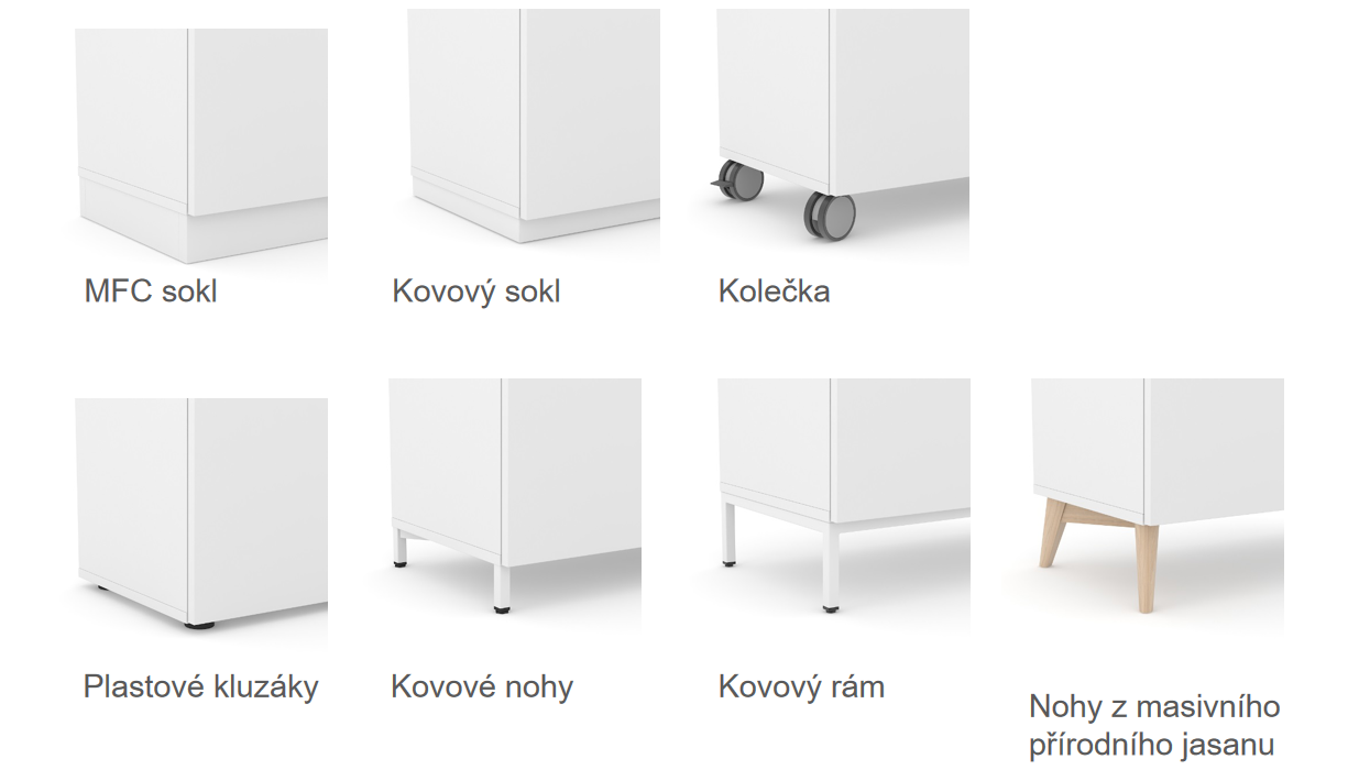 Ke každé skříni je třeba také zvolit vhodnou základnu. Na výběr máte běžné rektifikovatelné kluzáky, lamino či kovový sokl, kovové nožky či stylové dřevěné nohy z masivního jasanu. Pokud chcete se skříní později pohybovat, pořiďte si kolečka.