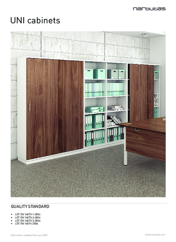 Systém UNI se vyrábí z melaminové dřevotřísky s ABS hranou. Vyznačuje se dnem o tloušťce 25 mm a boky o 18 mm. Police jsou standardně také tloušťky 18mm s nosností 25 kg a u skříní o šířce 1000 mm jsou pak 25 tlusté a unesou 32 kg. Pro ukládání dokumentů si můžete vybrat i výsuvné kovové zásuvky na závěsné kapsy. Všechny skříně jsou opatřeny kvalitními zámky (ve větších projektech oceníte i generální klíč a systém vyměnitelných zámkových vložek).