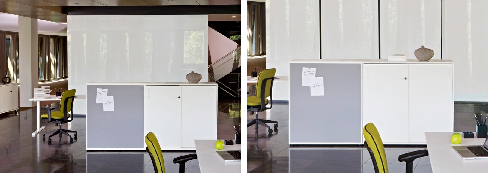 Některé skříňky umístěné do prostoru můžete doplnit o popisovatelný zádový panel či čalouněné panely, které vám oživí vaše kanceláře a navíc vylepší akustiku místnosti.