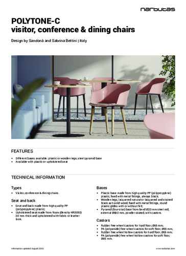 Univerzálnost, snadná údržba a jednoduché tvary, které zapadnou do každého prostředí. Židle POLYTONE-C navržená designérskou dvojicí Sandonà a Sabrina Bettini je ideální volbou zasedacích a konferenčních místností i jiných prostor. Ergonomicky tvarovaná skořepina je vyrobena z recyklovatelného plastu v několika moderních barvách. Můžete si vybrat, zda sedák bude s čalouněním či bez něj. Nabízíme celou škálu textilií. Čtyřnohou podnož z jasanového dřeva je možné doplnit kluzáky pro tvrdé či měkké podlahy. Tento model nabízíme také ve variantě s nylonovou nebo mobilní podnoží s kolečky. Pokud hledáte všestranný kousek, POLYTONE poskytne perfektní řešení a navíc přinese hřejivou atmosféru.