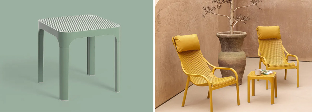 Řada venkovního nábytku NET zahrnuje modely, které byly navrženy k umístění na terasu nebo zahradu. Kolekci pro značku Nardi navrhl Raffaello Galiotto a najdete v ní židle, barové židle a stoly z recyklovatelné pryskyřice, zdobené radiálním vzorem čtvercových perforací. Nábytek má matný povrch a je vybaven protiskluzovými nohami. Pro větší pohodlí je možné přiobjednat pohodlný podsedák.
