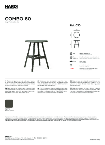 Designový stůl COMBO je univerzálním a trvanlivým doplňkem pro využití v outdooru. Kdykoli potřebujete naservírovat letní občerstvení nebo si jen během opalování odložit rozečtenou knížku, konečně máte ideálního parťáka! Stůl je zhotoven z polypropylenu, který je v podání NARDI GARDEN superodolný pro venkovní využití a po všech stránkách stylově tvarovaný. Zkosená čtyřnohá podnož stolu propůjčuje ideální stabilitu. Za příplatek je možné objednat zvýšenou podnož. Kruhovou svrchní desku nabízíme ve 2 průměrech. COMBO svým monochromatickým vzhledem skvěle doplní pestrobarevná křesla z kolekcí NARDI.