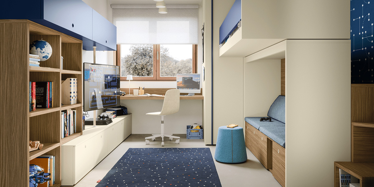 Teenageři potřebují svůj osobitý prostor. Už vědí, co chtějí a postupně budují své velké plány do budoucnosti. Vyžadují místo nejen pro spánek a učení, ale také pro objevování, experimentování i sdílení. Dokonale sladěná nábytková sada KIDS SPACE 17 byla sestavena tak, aby každý kus dával smysl a vytvořil místo pro dospívání dětí ve věku 13-16 let. Kombinace světlého dřeva s krémovou barvou a modrými akcenty bude ideálním zázemím.