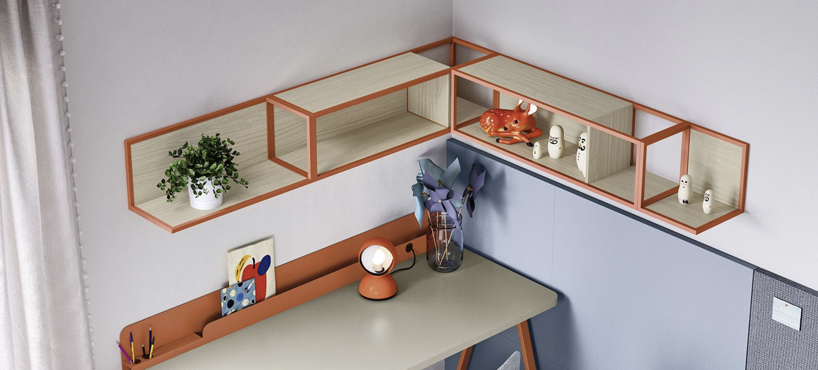 Dětská knihovna, to je multifunkční prostor pro hračky, knížky, učebnice i památky z výletů. Krása, ergonomie, bezpečnost a funkce jsou vlastnosti, s nimiž značka navrhuje dětský nábytek, aby byl každý prostor stimulující, lákavý, bezpečný a uvolňující: nejlepší možné místo pro hraní, spaní, učení a růst. Nidi vykresluje ložnici i nábytek v ní jako příběh vybavený doplňky, tapetami, látkami a samolepkami - prvky, které dodávají charakter a činí místnost osobní, teplou a příjemnou.