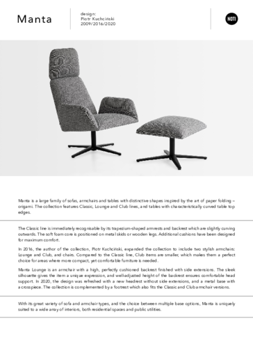 Kolekce MANTA je inspirovaná origami - japonským uměním skládání rozličných motivů z papíru. Autorem kolekce je Piotr Kuchciński, který absolvoval fakultu Architektury na Technické univerzitě v Poznani a s firmou NOTI spolupracuje už 15 let. Charakteristické lichoběžníkové opěrky a područky se mírně naklánějí směrem ven, měkká pěnová hmota s čalouněním lehce sedí na subtilní podnoži, která je vyrobena z oceli nebo jasanového dřeva. Ocelovou podnož lze dodat také lakovanou v různých barvách. Dřevěnou podnož nabízíme v přírodním odstínu nebo v černé, šedé, tmavě modré, červené a bílé barvě. Kolekci křesel a podnožek skvěle doplňují stoly s typicky ohnutými ráfky. Potřebujete pomoci s výběrem? Naši specialisté vám rádi poradí, neváhejte je kontaktovat.