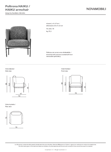 Důraz na každý detail, čisté linie a kvalita provedení, to vystihuje křeslo HAIKU. Měkká obálková skořepina je zasazena do graficky působícího kovového rámu. Tento model si hraje s kombinacemi textur a to mu dodává na neokoukanosti. Ocelová konstrukce je vyplněná pěnou a polyesterem. Lakovanou kovovou podnož máme dispozici v široké škále laků. Čalounění lze vybírat z mnoha druhů a barev textilií a kůže tak, aby ladilo se zbytkem vybavení interiéru. Na dotaz je možná kombinace různých tkanin ze stejné kategorie. Tak si dopřejte kousek, který se stane dominantou každého prostoru a zaujme každou návštěvu.