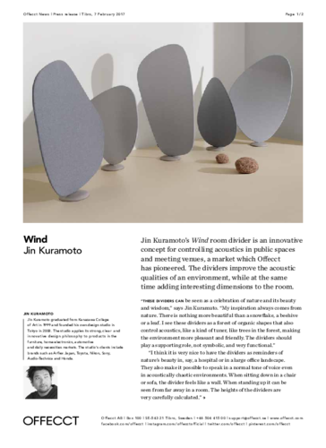 "Tyto oddělovače lze vnímat jako oslavu přírody a její krásy a moudrosti," říká Jin Kuramuto, designér akustických oddělovačů Wind. Inspiraci našel právě v přírodě a kolekci vnímá jako les organických tvarů, které pomáhají ovládat zvuk v místnosti. Prostředí také opticky rozdělí a zpříjemní. Paravany byly doplněny ještě stolem ve stejném designu. Ten pomůže dotvořit ucelenou atmosféru celého interiéru.