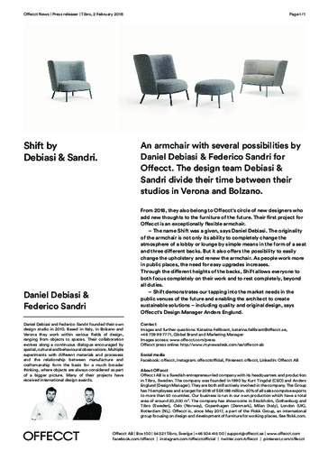 Originalita nábytku spočívá v umění změnit celkovou atmosféru prostoru. Není to ale to jediné, možnost snadno vyměnit čalounění a přizpůsobovat se dnešní rychlé době, která si žádá neustálé posuny, je dalším plusovým bodem. Designérská dvojice Daniel Debiasi & Federico Sandri je si toho plně vědoma a tak této kolekci dala do vínku kromě naprosto bezchybného designu i variabilitu. Série obsahuje křesla s různými výškami opěrek, kovovými či dřevěnými nohami a několika barevnými variantami čalounění.