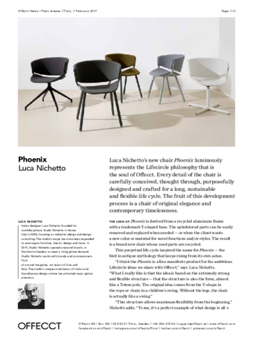 Kolekce Phoenix zářivě reprezentuje filozofii Lifecircle, která je duší společnosti Offecct. Každý kus je pečlivě promyšlený a účelně navržený a vyrobený pro dlouhý, udržitelný a flexibilní životní cyklus. Výsledkem tohoto vývojového procesu jsou židle s originální elegancí, trvanlivostí a současnou nadčasovostí. Designér Luca Nichetto chce poukazovat na alternativní materiály i způsoby výroby a přiblížit tak klientům myšlenku udržitelnosti.