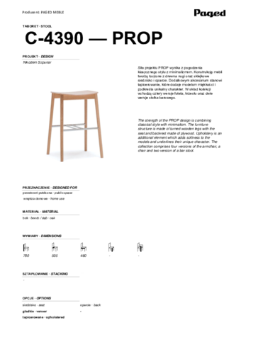 Designér Nikodem Szpunar našel sílu v kombinaci klasiky s minimalismem a navrhl elegantní barovou stoličku PROP, která zapadne do soukromého i komerčního interiéru. Odolnost a kvalita židle jsou zajištěny řemeslnou precizností i inovativním přístupem. Podnož je vyrobena ze soustruženého bukového nebo dubového dřeva v několika dostupných povrchových úpravách, sedák je z překližky. Pohodlný sedák navíc kromě dřevěné verze lze objednat s čalouněním, které je k dispozici v mnoha barvách látky i kůže, včetně možnosti dodání vlastního materiálu. Opěrku pro nohy lze vybírat z černého nebo chromovaného kovu, pro podnož si zvolíte kluzáky podle svých potřeb. Celá kolekce PROP zaujme nejen vzhledem, ale také komfortem každodenního používání.