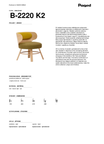 Designér Tomek Rygalik svým návrhem křesla K2 poukazuje na horský styl nábytku a jeho řemeslnou výrobu. Tento model do interiéru vnese vřelou útulnost a nadčasovost. Ohýbaný dřevěný kruh, podnož a překližkový opěrák jsou vyrobeny z bukového dřeva v několika dostupných povrchových úpravách. Pohodlný sedák a opěrka jsou k dispozici v mnoha barvách látky i kůže, včetně možnosti dodání vlastního materiálu. Pro podnož si můžete vybrat kluzáky podle svých potřeb. Celá kolekce K2 zaujme nejen vzhledem, ale také komfortem každodenního používání.
