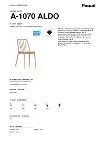 Stohovatelnou židli ALDO navrhl designér Grzegorz Gancarczyk tak, aby zapadla jak do moderních, tak klasických prostor. Spojení zahnutých a přímých linií vnese do interiéru útulnost a osobitost. Je vyrobena z bukového dřeva v několika dostupných povrchových úpravách, pro podnož si můžete vybrat kluzáky podle svých potřeb. ALDO je k dispozici také jako barová židle.