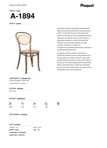 Historie polské společnosti Paged, která je známá svým mistrovstvím v ohýbání dřeva, sahá až do roku 1881. Jako jedna z nejvýznamnějších firem ve svém oboru navazuje na tradici Michaela Thoneta. Díky kombinaci tradičního řemesla a moderních technologií vytváří esteticky přitažlivý, ergonomický a odolný nábytek. Židle, křesla, barové stoličky, stoly a další produkty jsou oblíbené po celém světě. Precizně zpracované kousky se hodí jak do domácností, tak do komerčních prostor, jako jsou restaurace, hotely nebo kanceláře.