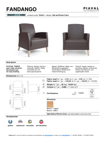 Kvalitní křeslo FANDANGO 78-62/1 je krásné a elegantní napohled, přesto v sobě skrývá mnohem víc. Stejně jako další sedací prvky PIAVAL vhodné pro seniory, vyniká mimořádnou variabilitou, kvalitou zpracování a vysokou odolností do zátěžových prostor. Tento model je navíc ještě mimořádně prostorný díky širším proporcím. Robustní kostra křesla na vyšší lehce zkosené podnoži z bukového dřeva poskytuje skvělou stabilitu a je na výběr v různých odstínech moření. Zakončena je praktickými kluzáky. Měkce čalouněný a odnímatelný sedák a opěrák doplněné taktéž čalouněnými područkami v textilu dle výběru, kůži nebo vaší vlastní dodané látce slibují dlouhotrvající komfort při sezení. Praktické a stylové křeslo FANDANGO 78-62/1 využijete v jakémkoli věku. Doporučujeme využít možností voděodolného zpracování, odnímatelného sedáku či úpravy proti proleženinám. Pro více informací kontaktujte naše specialisty, kteří vám poskytnou detaily o dalších doplňcích a pomohou vám sestavit kousek přesně podle vašich představ.