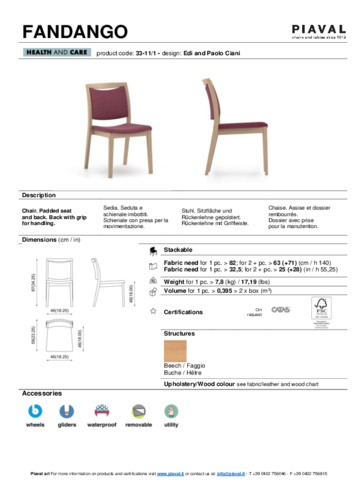 Odolná židle FANDANGO 33-11/1 byla stvořena značkou PIAVAL pro vysokou frekvencí používání a zátěže, například i v medicínských zařízeních pro péči o druhé. Bytelná konstrukce židle je zhotovena z bukového dřeva v různých variantách moření. Robustní podnož s mírně zkosenými zadními nohami zaručuje lepší stabilitu. Zakončena je dle přání kluzáky nebo kolečky pro dokonalou mobilitu. Měkce čalouněný sedák a opěrák se postarají o bezkonkurenční pohodlí i při delším sezení. Na výběr jsou zde různé odstíny textilií a také zpracování z vámi dodané látky, čímž si můžete snadno vytvořit originální kousek na míru. Na dotaz nabízíme možnost zpracování z žáruvzdorné pěny, použití odnímatelného sedáku (pouze pro neprodyšné látky) a voděodolný ochranný film na sedák. Model je stohovatelný. Pro více informací kontaktujte naše specialisty, kteří vám sdělí všechny detaily o možném příslušenství a pomohou vám sestavit kousek přesně podle vašich představ.