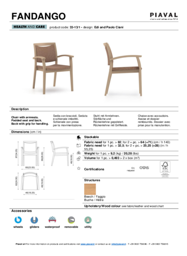 Odolná židle FANDANGO 33-13/1 s područkami byla stvořena značkou PIAVAL pro vysokou frekvencí používání a zátěže, například i v medicínských zařízeních pro péči o druhé. Bytelná konstrukce židle s područkami je zhotovena z bukového dřeva v různých variantách moření. Prohlédněte si také variantu bez područek. Robustní podnož s mírně zkosenými zadními nohami zaručuje lepší stabilitu. Zakončena je dle přání kluzáky nebo kolečky pro dokonalou mobilitu. Měkce čalouněný sedák a opěrák se postarají o bezkonkurenční pohodlí i při delším sezení. Na výběr jsou zde různé odstíny textilií a také zpracování z vámi dodané látky, čímž si můžete snadno vytvořit originální kousek na míru. Na dotaz nabízíme možnost zpracování z žáruvzdorné pěny, použití odnímatelného sedáku (pouze pro neprodyšné látky) a voděodolný ochranný film na sedák. Model je stohovatelný. Pro více informací kontaktujte naše specialisty, kteří vám sdělí všechny detaily o možném příslušenství a pomohou vám sestavit kousek přesně podle vašich představ.